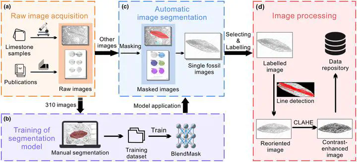 Fusulinid foraminifera are among the most common microfossils of the Late Palaeozoic and act as key fossils for stratigraphic correlation, paleogeographic and paleoenvironmental indication, and evolutionary studies of marine life. Accurate and efficient identification forms the basis of such research involving fusulinids but is limited by the lack of digitized image datasets. This article presents the first large image dataset of fusulinids containing 2,400 images of individual samples subjected to 16 genera of all six fusulinid families and labelled to species level. These images were collected from the literature and our unpublished samples through an automatic segmentation procedure implementing BlendMask, a deep learning model. The dataset shows promise for the efficient accumulation of fossil images through automated procedures and will facilitate taxonomists in future morphologic and systematic studies.